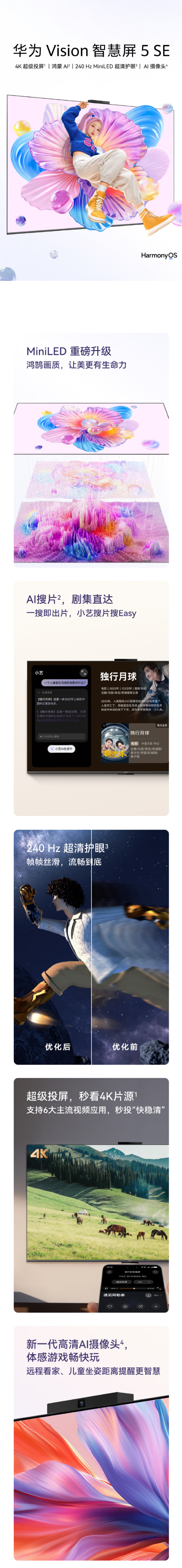 华为电视Vision智慧屏 5 SE 75英寸 MiniLED鸿鹄画质 4K超级投屏平板电视机 55英寸 华为5 SE55智慧屏